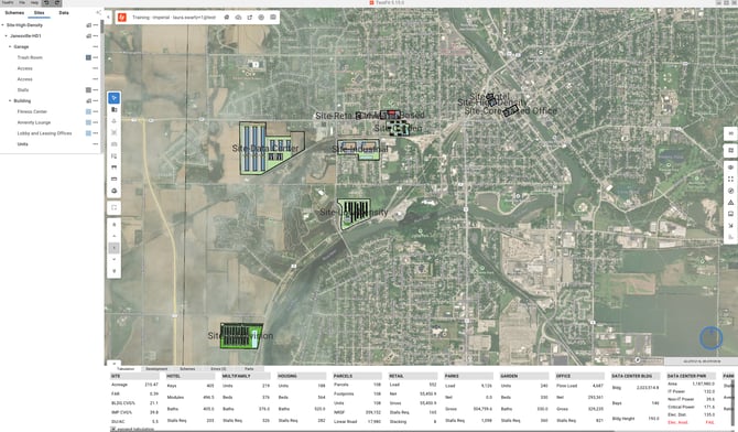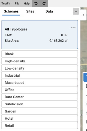 - The file will reflect the first scheme upon launch which has a sample of TestFit typologies applied to unique sites.
