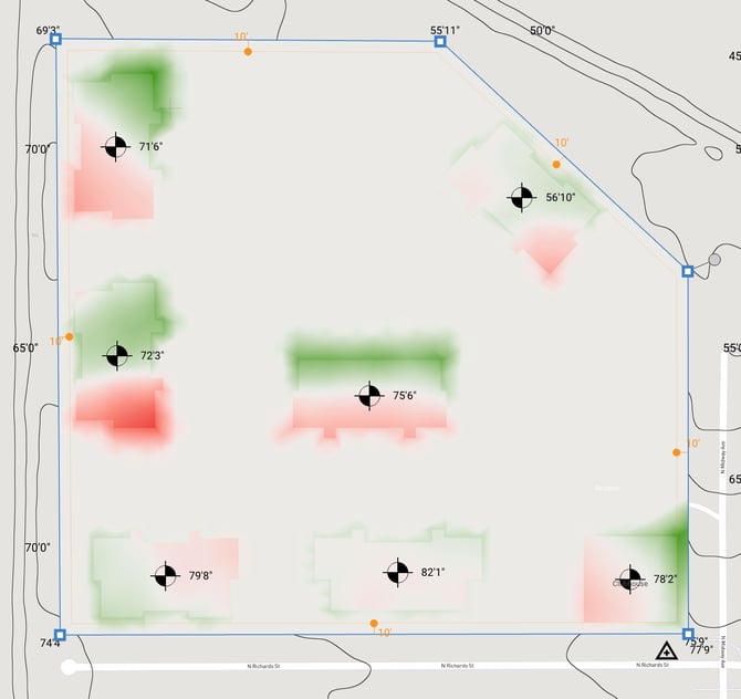 An auto-graded site adds cut and fill material around the building footprints that slopes at a set ratio to the existing site around it.