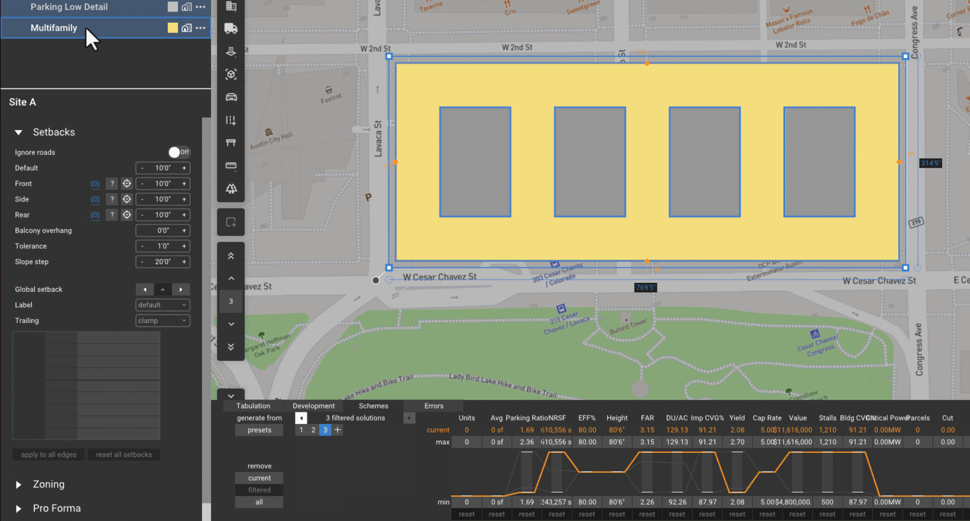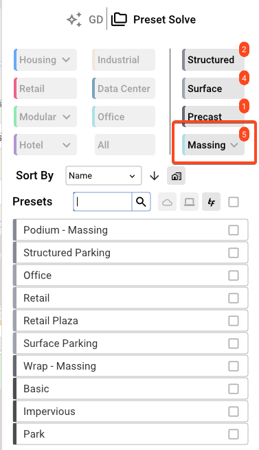 - Under the Mass-Based typology, the Podium - Low Detail and Wrap - Low Detail presets can be assigned deal specific parameters that can generate solves onto sites.