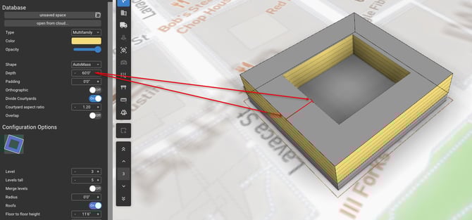 - For Multifamily masses The depth of the mass adjusts the overall dimension from the front to back facade as indicated below.