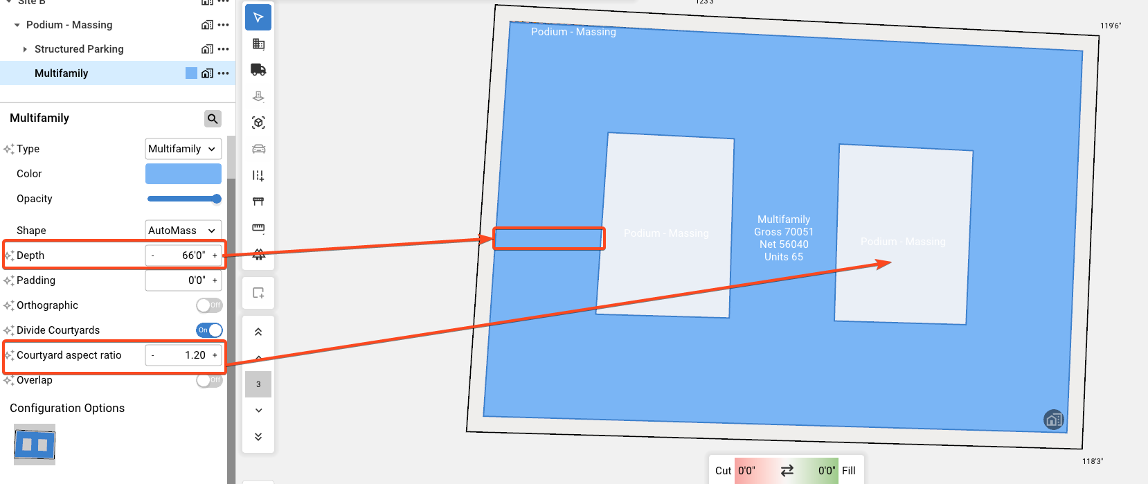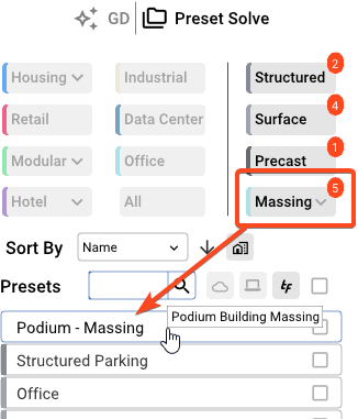 Under the Massing presets, the Podium - Massing and Wrap - Massing presets can be assigned deal specific parameters that can generate solves onto sites.