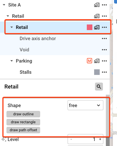- With the Retail/Multifamily layer selected in the Nav Tree, scroll down to the Property Panel. The shape type will be set to AutoMass.