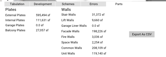 The extended tabulation gives a detailed breakdown of different area take-offs both per-floor and in total. This view is what is exported out to the .csv and .pdf.