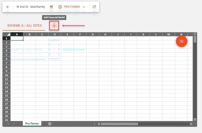 Once in the Pro Forma, select the "+" icon to open a new workbook for a financial model.