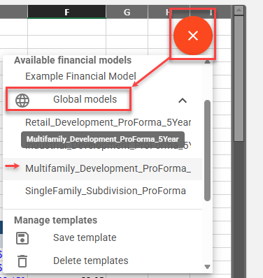 Sample Global Models include the following: Retail, Industrial, Multifamily, and Subdivision models. Examples of how live links are applied to financial model cells are included within these models.