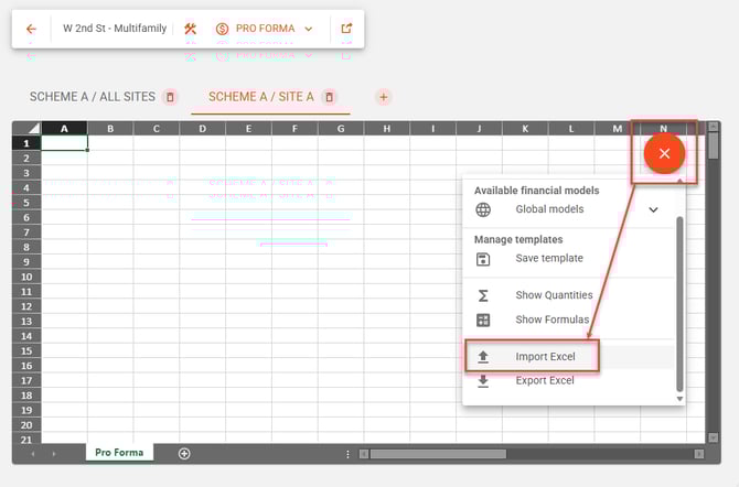 How do I export or import an Excel file into a Pro Forma or financial model?