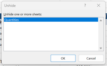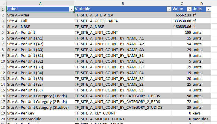In Excel, you can unhide the list of Quantities export from the TestFit model based on the applied scheme and site combination of the deal that was applied to the financial model.