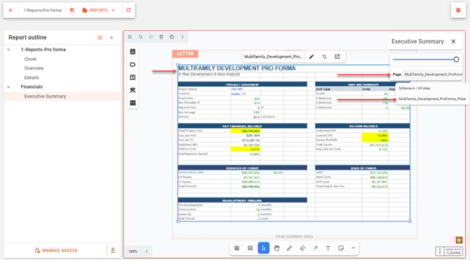 The Pro Forma Views feature empowers you to embed live, editable pro forma views directly into their feasibility reports — dynamically linked to the underlying feasibility model — so users can customize which metrics appear, make real-time adjustments, and instantly see how changes flow through their analysis, all without leaving the report.
