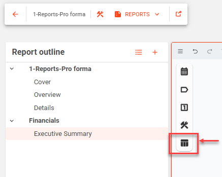 In the Report outline panel on the left, expand the desired section and select the sheet you want to add the Pro Forma view to.