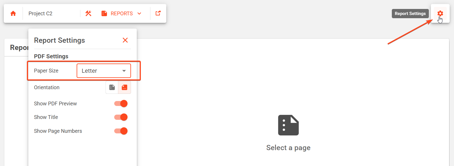 The orientation, and other configuration options can also be found in the Report Settings: