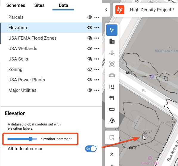 The elevation toggle shows the topography lines (provided by ESRI) for the site.