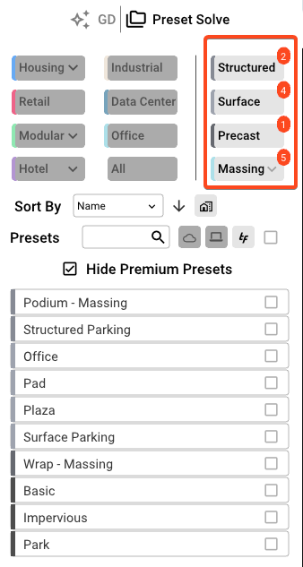 - Make sure the Massing option and Structure/Surface/Precast options are enabled to see the default presets (Office/Pad/Plaza/Podium - Massing/Structured Parking/Surface Parking/Wrap - Massing)
