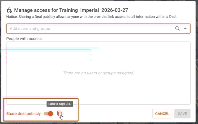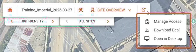 When the Share deal publicly toggle is enabled you can click the Click to copy URL icon to send a viewable link to anyone regardless of their affiliation with your organization (ie. clients, owners, etc.). The recipient will be able to see your deal in 3D and the site information/tabulation, but won't be able to make any modifications or be able to download the deal.