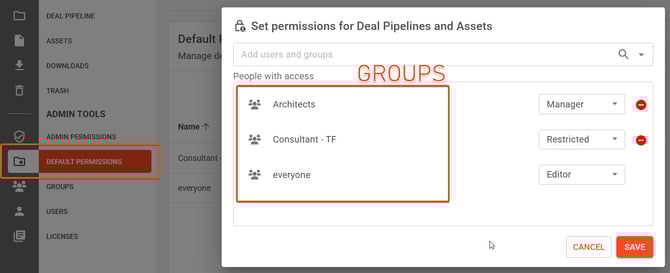 By default, the “Everyone” group is given “Editor” access to the organization’s Deal Pipeline directory which allows all users to create folders in the Deal Pipeline directory as well as save deals and assets by default.