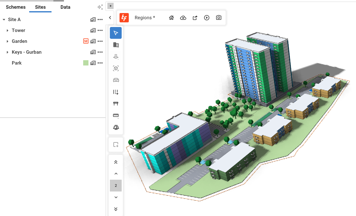 Simply put, regions are sites within sites. Creating multiple types of buildings within a single site can be achieved with the regions tool.