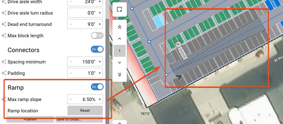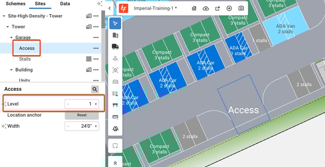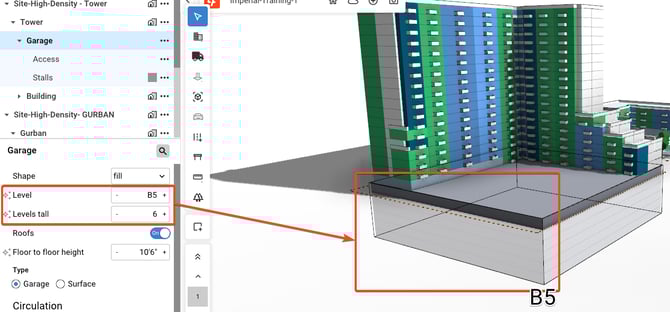 Level - Controls the level that the lowest tray of parking starts on. If a structured garage is 6 levels high and starts on level B5, 1 level of parking will be above grade