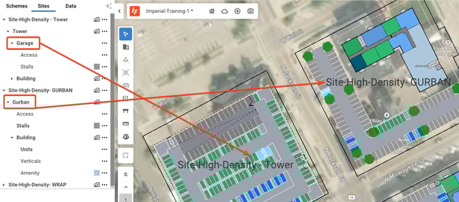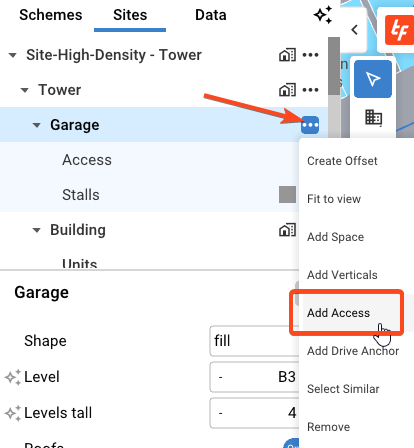 By default, all structured garages and surface parking lots start with one default access point. It is nested below the Garage/Gurban layer.