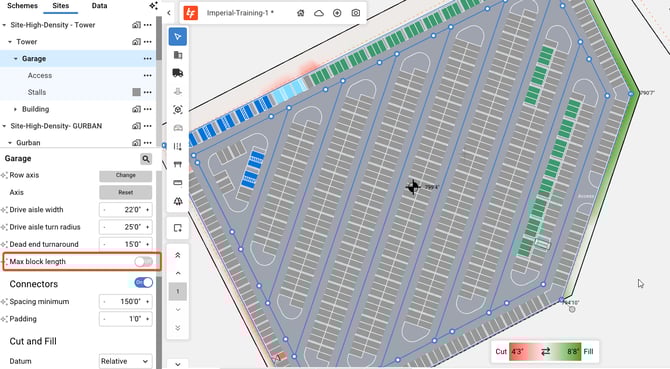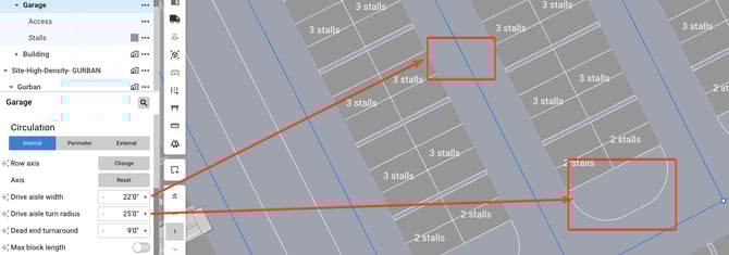 Max block length - When toggled on, numerical input allows you to specify the maximum length of a run of stalls before a drive aisle is place.