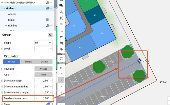 Dead end turnaround - Controls the distance to stalls at the end of a dead-end drive aisle.