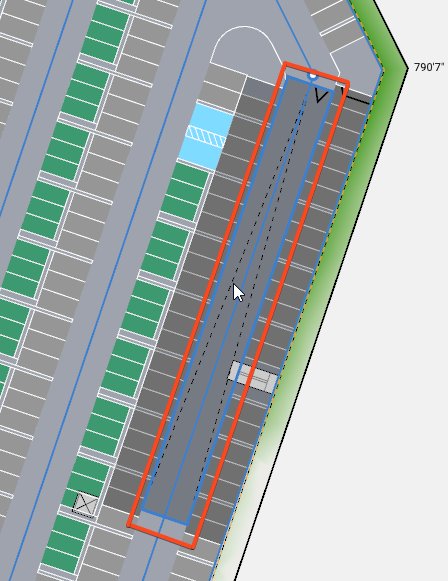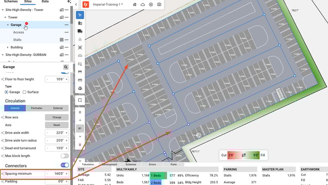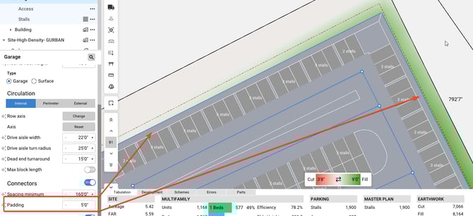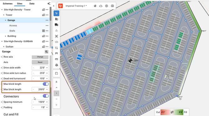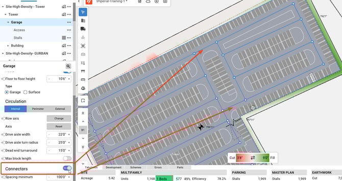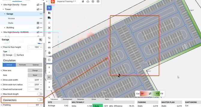 When the shape of a garage or surface parking is irregular, as seen below, TestFit can break the portions into different 'legs' and there are connector settings.