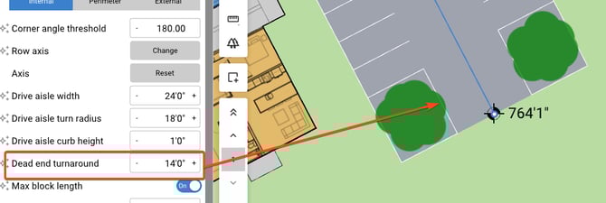Dead end turnaround - Controls the distance at the end of a drive aisle where stalls can not be placed