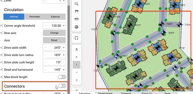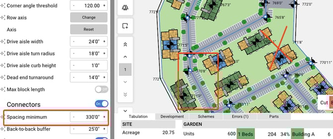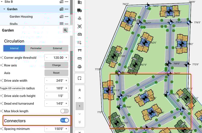 Connectors toggle - When a Site has an irregular shape, the Connects toggle will determine if both areas are connected by drive aisles.