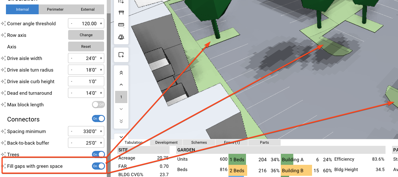 Fill gaps with green space - Toggles between concrete or green space areas around parking. Effects Impervious coverage percentage.